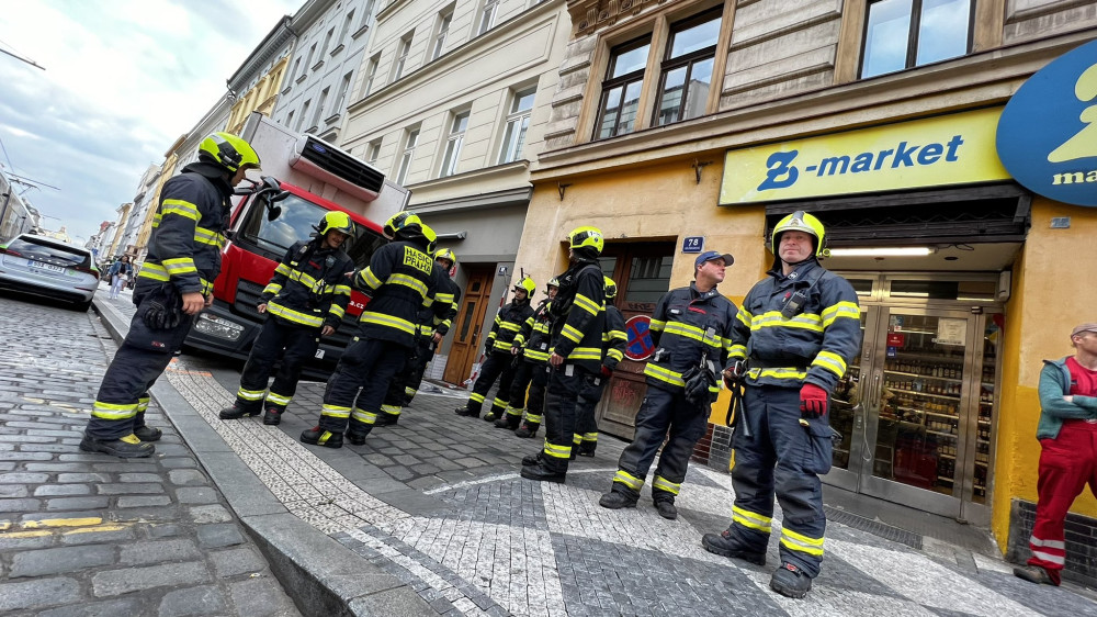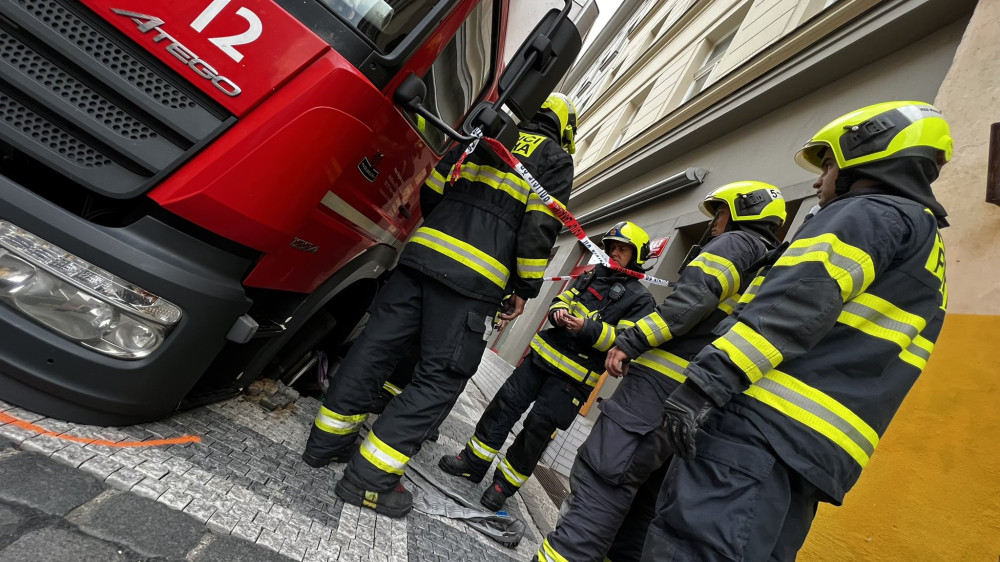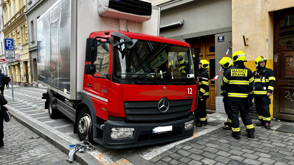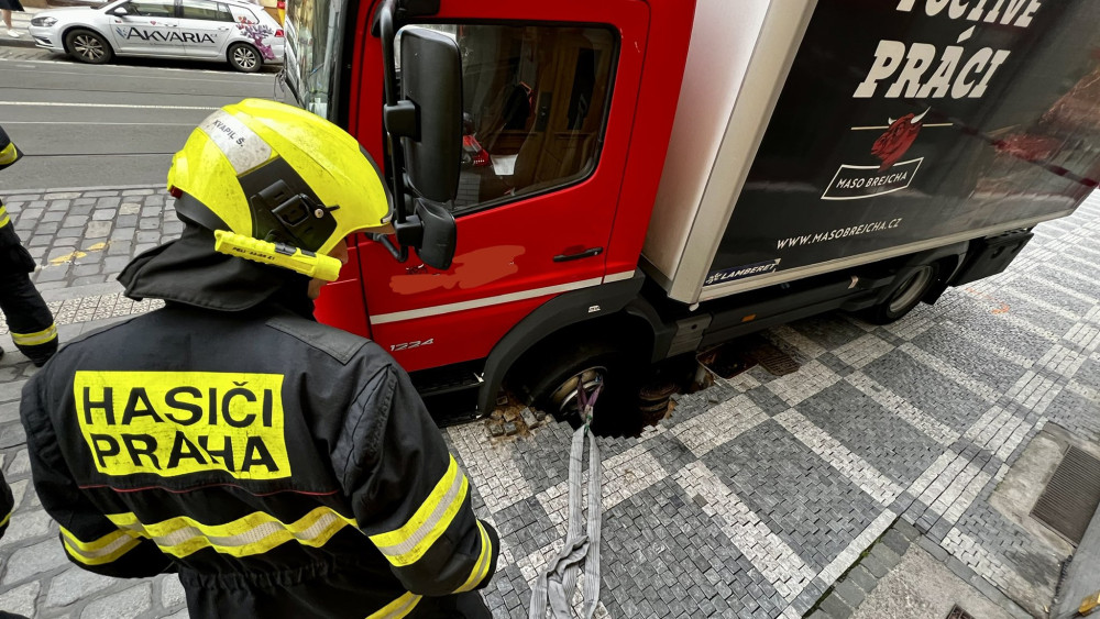 V centru Prahy se do chodníku propadlo nákladní auto