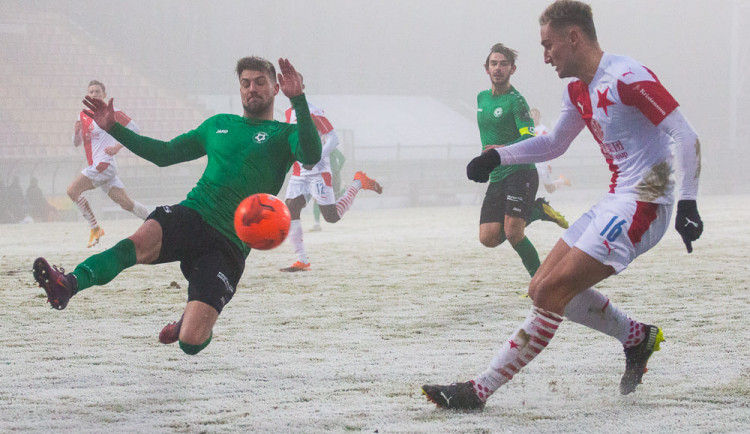 Slávisté se na kluzkém hřišti pokrytém jinovatkou hledali a příbramskou branku oranžovým míčem poprvé vážněji ohrozili až v 15. minutě, kdy Stanciu z halfvoleje těsně minul.