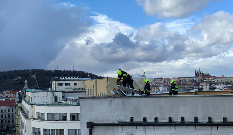 Ve Vodičkově ulici hasiči zasahují u uvolněných plechů na střeše.