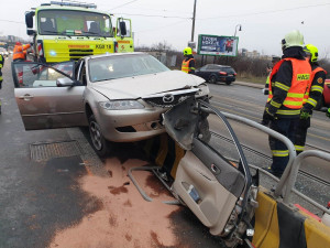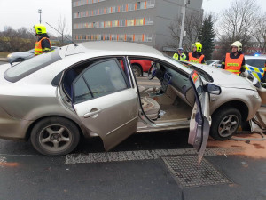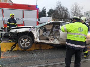 FOTO: Dnes ráno došlo ke střetu tramvaje s autem. Zraněnou osobu museli hasiči z auta vyprostit