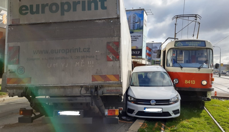 Dnes dopoledne zasahovali hasiči, policisté i záchranáři v Poděbradské ulici, kde došlo ke střetu osobního auta, tramvaje a nákladního vozidla. Jeden člověk skončil v péči záchranářů.